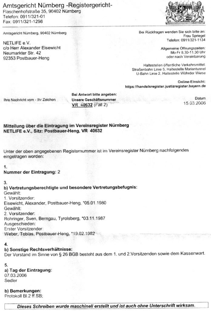 Vereinsregisterauszug 2006